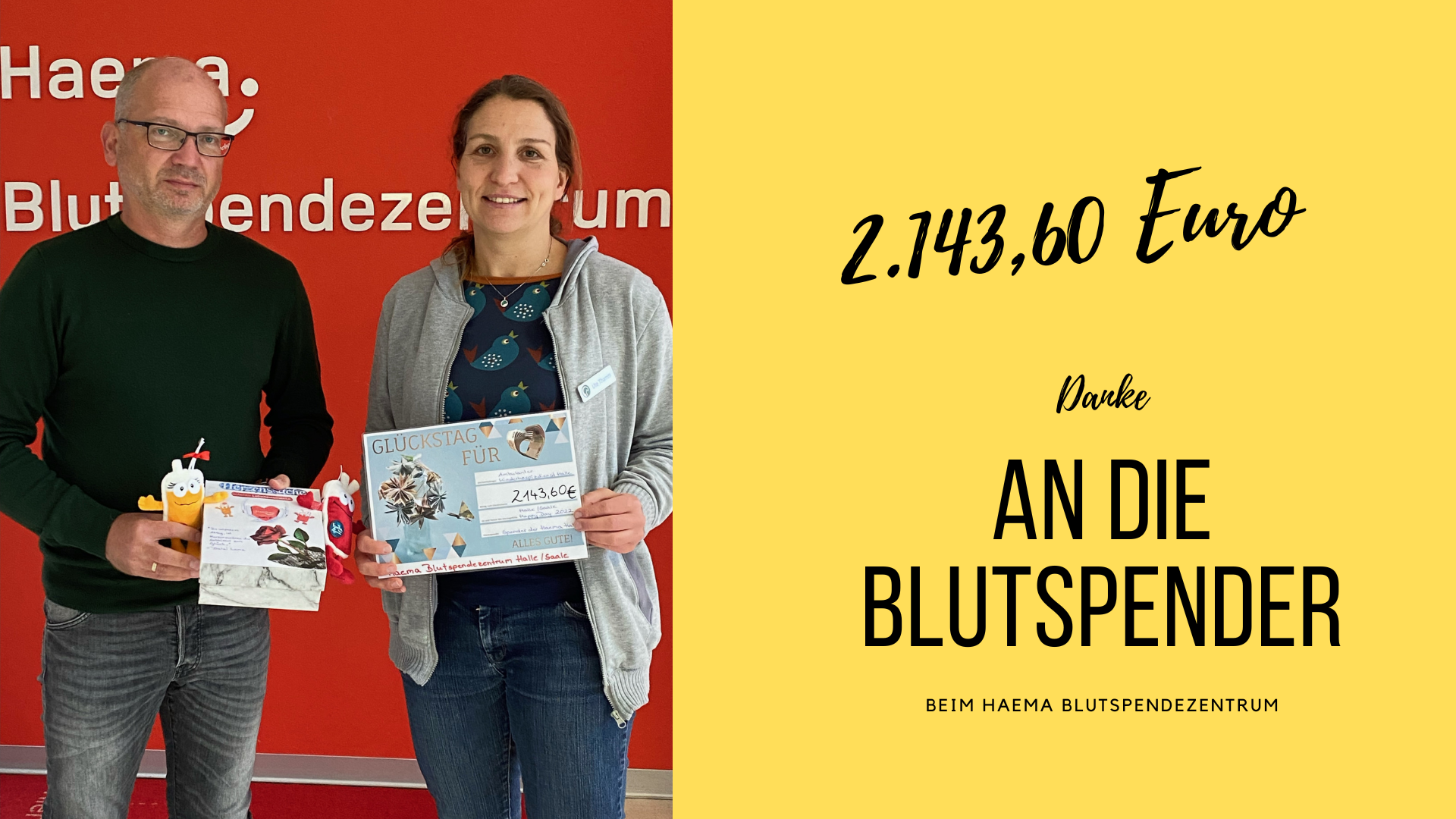 In der letzten Woche waren wir zu Gast beim Haema Blutspendezentrum in Halle Neustadt. Herr Fuchs überreichte uns einen Spendencheck in Höhe von 2.143,60 Euro für die Kinderhospizarbeit. Dieser Betrag ergibt sich aus den Aufwandsentschädigungen für Blutspenden, die dem Hospiz zukommen sollen.