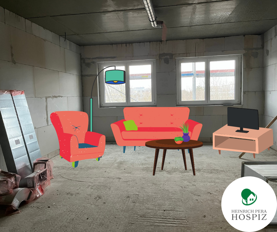 In der letzten Woche haben wir ein paar Fotos im Inneren des neuen Hospizes gemacht. Um zu veranschaulichen, welche Funktion die Räume haben werden, haben wir sie mal mit einigen gezeichneten Elementen ausgestattet.
