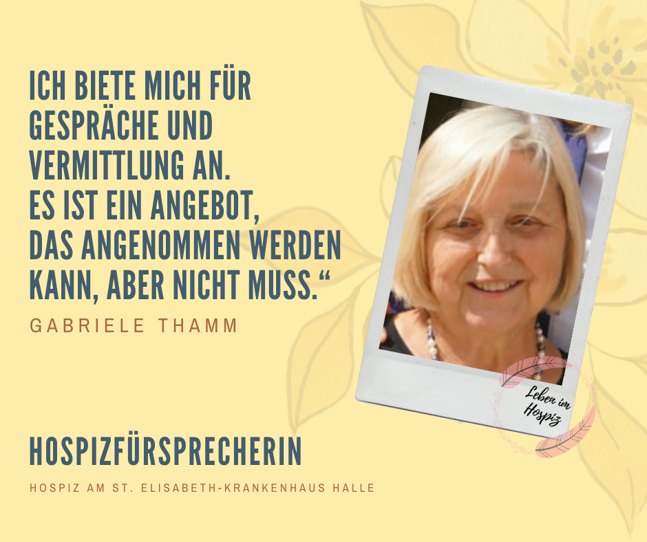Etwa 15 Jahre lang war Gabriele Thamm selbst im Hospiz beschäftigt. Sie arbeitete als Schwester und koordinierte die Betten im stationären Bereich. Sie kennt sich aus und weiß, wo die Sorgen und Nöte von Patienten und auch Personal liegen. Heute bringt sie sich als Hospizfürsprecherin ein.